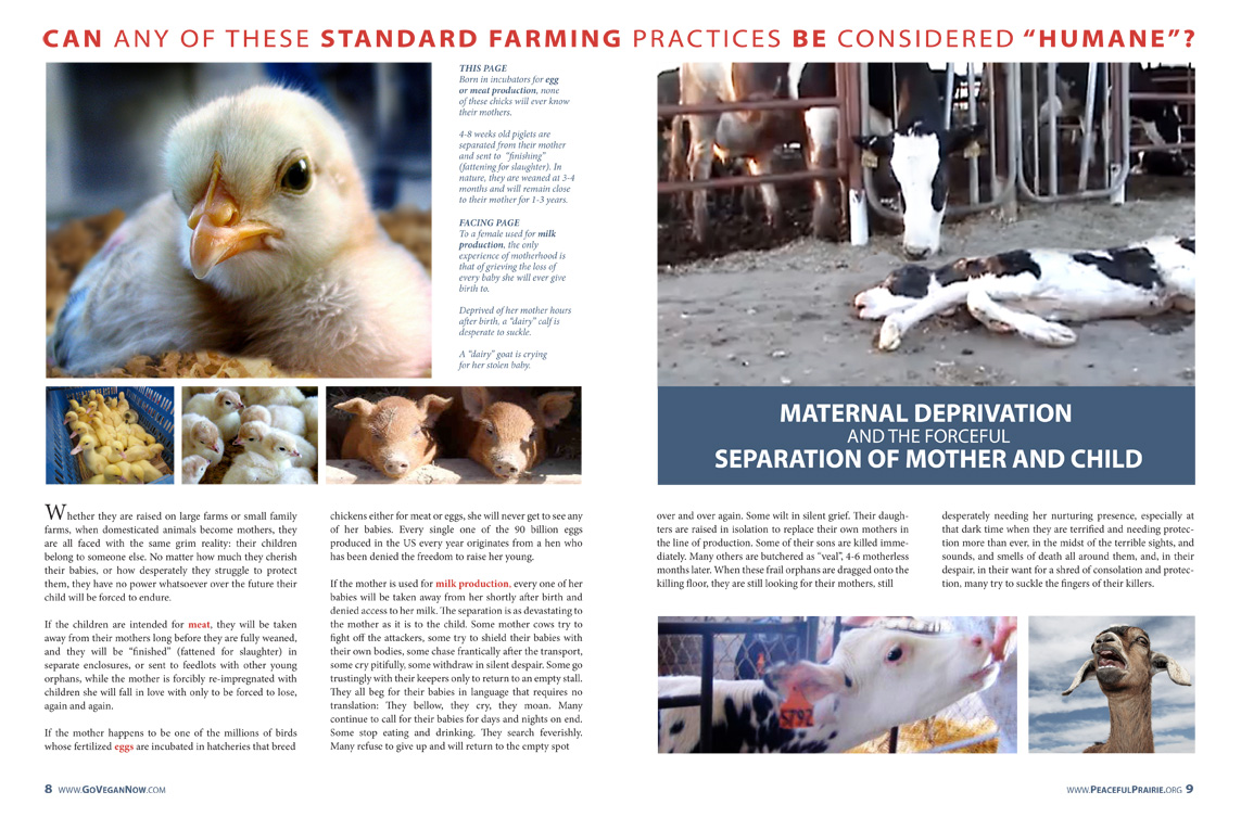 If.the mother is used for milk production, every one of her babies will be taken away from her shortly after birth and denied access to her milk. The separation is as devastating to the mother as it is to the child. Some mother cows try to fight off the attackers, some try to shield their babies with their own bodies, some chase frantically after the transport, some cry pitifully, some withdraw in silent despair. Some go trustingly with their keepers only to return to an empty stall. They all beg for their babies in language that requires no translation: They bellow, they cry, they moan. Many continue to call for their babies for days and nights on end. Some stop eating and drinking. They search feverishly. Many refuse to give up and will return to the empty spot over and over again. Some wilt in silent grief.