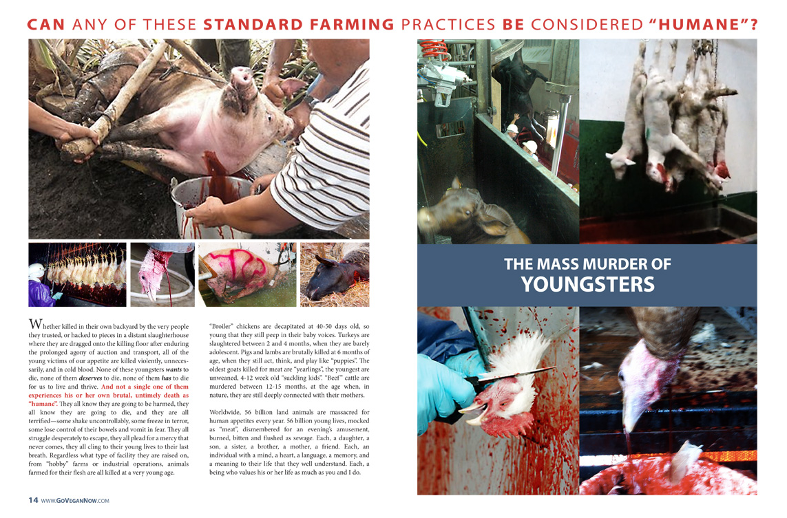 Whether killed in their own backyard by the very people they trusted, or hacked to pieces in a distant slaughterhouse where they are dragged onto the killing floor after enduring the prolonged agony of auction and transport, all of the young victims of our appetite are killed violently, unnecessarily, and in cold blood.