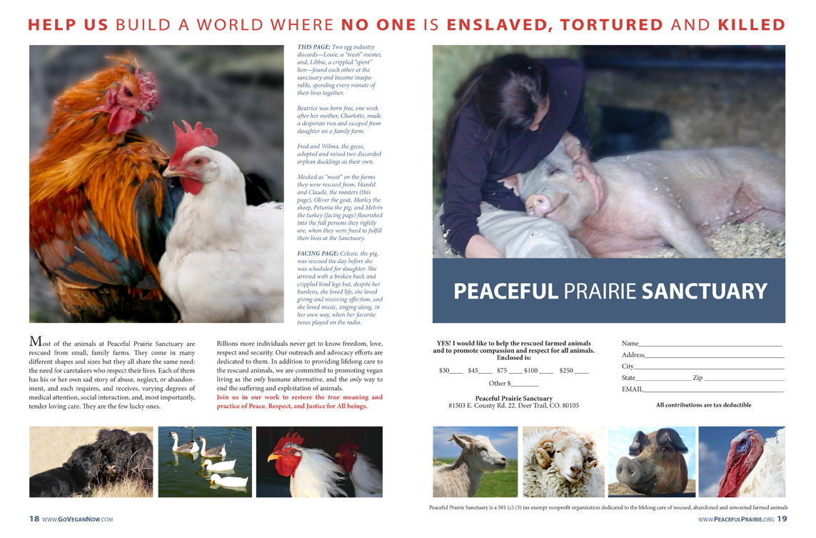 Most of the animals at Peaceful Prairie Sanctuary are rescued from small, family farms. They come in many different shapes and sizes but they all share the same need: the need for caretakers who respect their lives. Each of them has his or her own sad story of abuse, neglect, or abandonment, and each requires, and receives, varying degrees of medical attention, social interaction, and, most importantly, tender loving care. They are the few lucky ones. Billions more individuals never get to know freedom, love, respect and security. Our outreach and advocacy efforts are dedicated to them. In addition to providing lifelong care to the rescued animals, we are committed to promoting vegan living as the only humane alternative, and the only way to end the suffering and exploitation of animals.