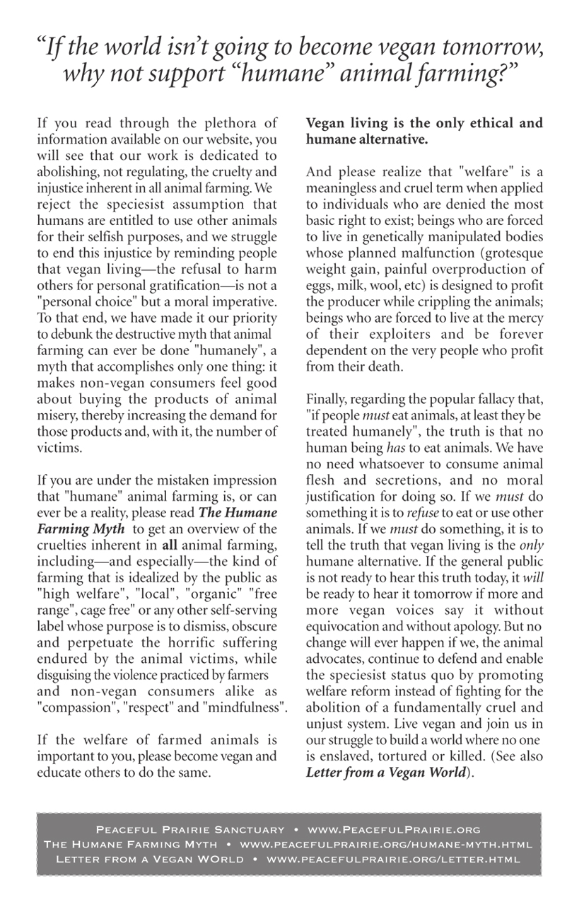 The self-serving deception that animal exploitation can be done "humanely" has been so actively, constantly, and widely promoted over the past decade, and it's been so readily embraced by those who are eager to lie to themselves about the impact of their consumer choices, that more and more people today have convinced themselves that labeling the products of animal misery "free range", instead of "factory farmed", will change the truth of the victims' suffering. The activists of Peaceful Prairie Sanctuary are so often faced with this fallacy, that we've had to create a new flyer in an effort to address what has become one of the most frequently asked questions: